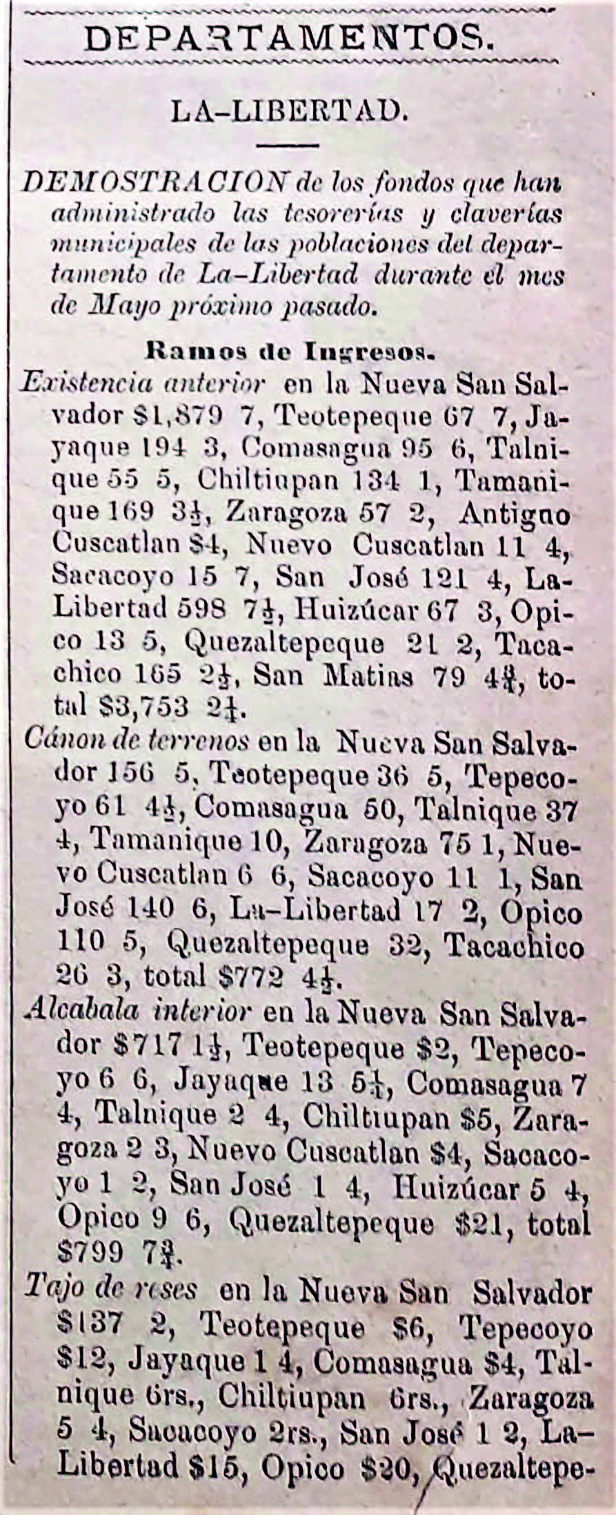 In May 1881, the municipality of San José Villanueva paid Internal Alcabala Tax to the Government of that time, a total of 14 pesos, as a purchase sales, 12 pesos as a tax to the Tajo de RESTA, 140. 6 pesos per canon of land . This constitutes a more or less thorough control of the taxes that the municipality paid to the State, this control was executed once a year and a failure was issued in the official newspaper the following year.